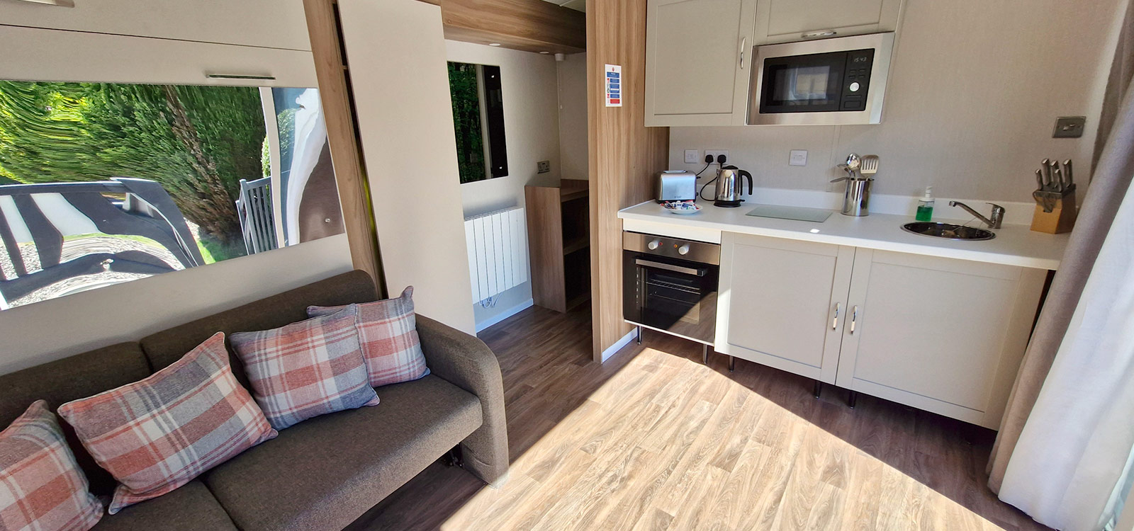 The pod has a sofa/pull-down double bed, an en-suite toilet and shower room. The small kitchenette includes an oven, microwave, toaster & kettle, and all kitchen utensils, plates etc are included.